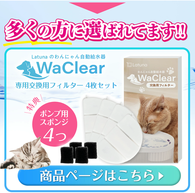 猫ちゃんの給水器をお求めの方はこちらのlatunaさんの【WaClear(ワクリア)】をおすすめします。ちなみにうちのにゃんこは喜んで飲んでいます。こちらから購入できます↓